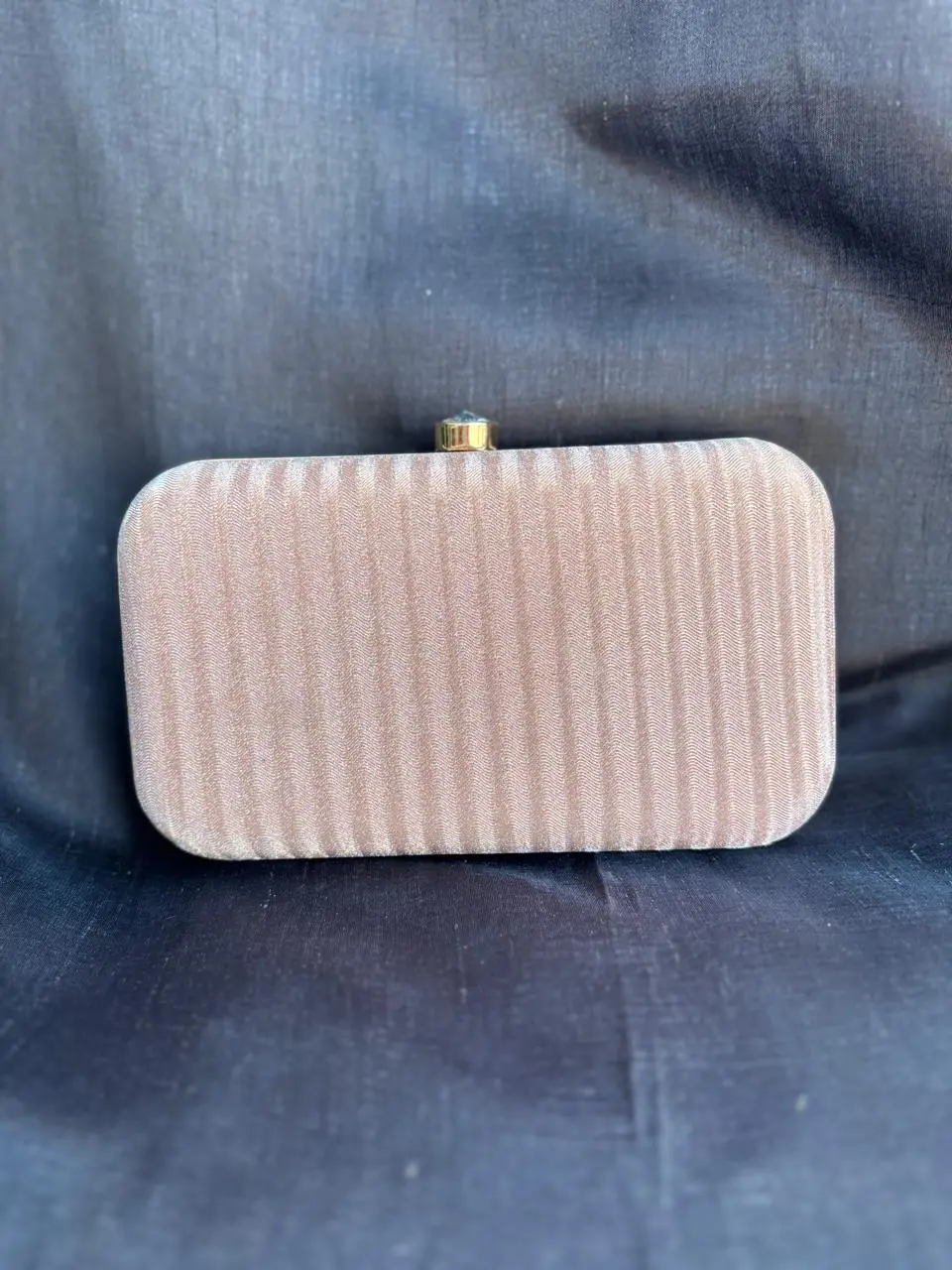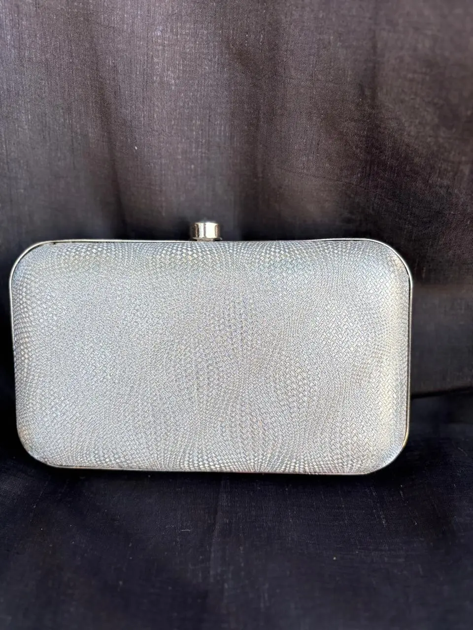 • Its sleek, structured silhouette is complemented by a subtle, luminous texture and a minimalist metal clasp.