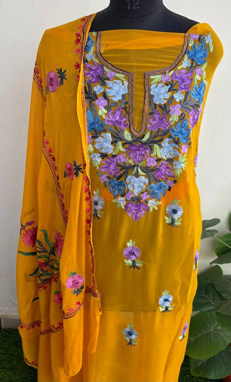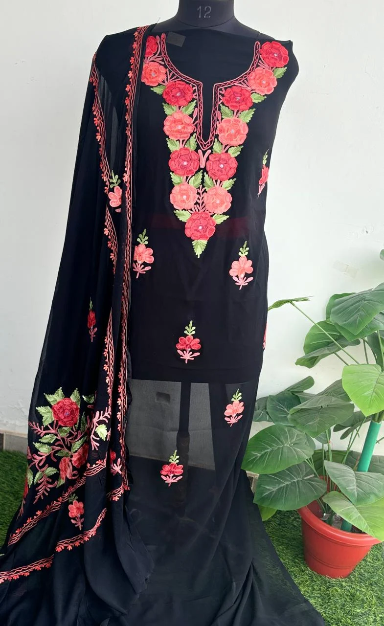 - Crafted from luxurious pure Georgette, the flowing fabric is meticulously decorated with intricate Kashmiri embroidery on the front panel and dupatta.