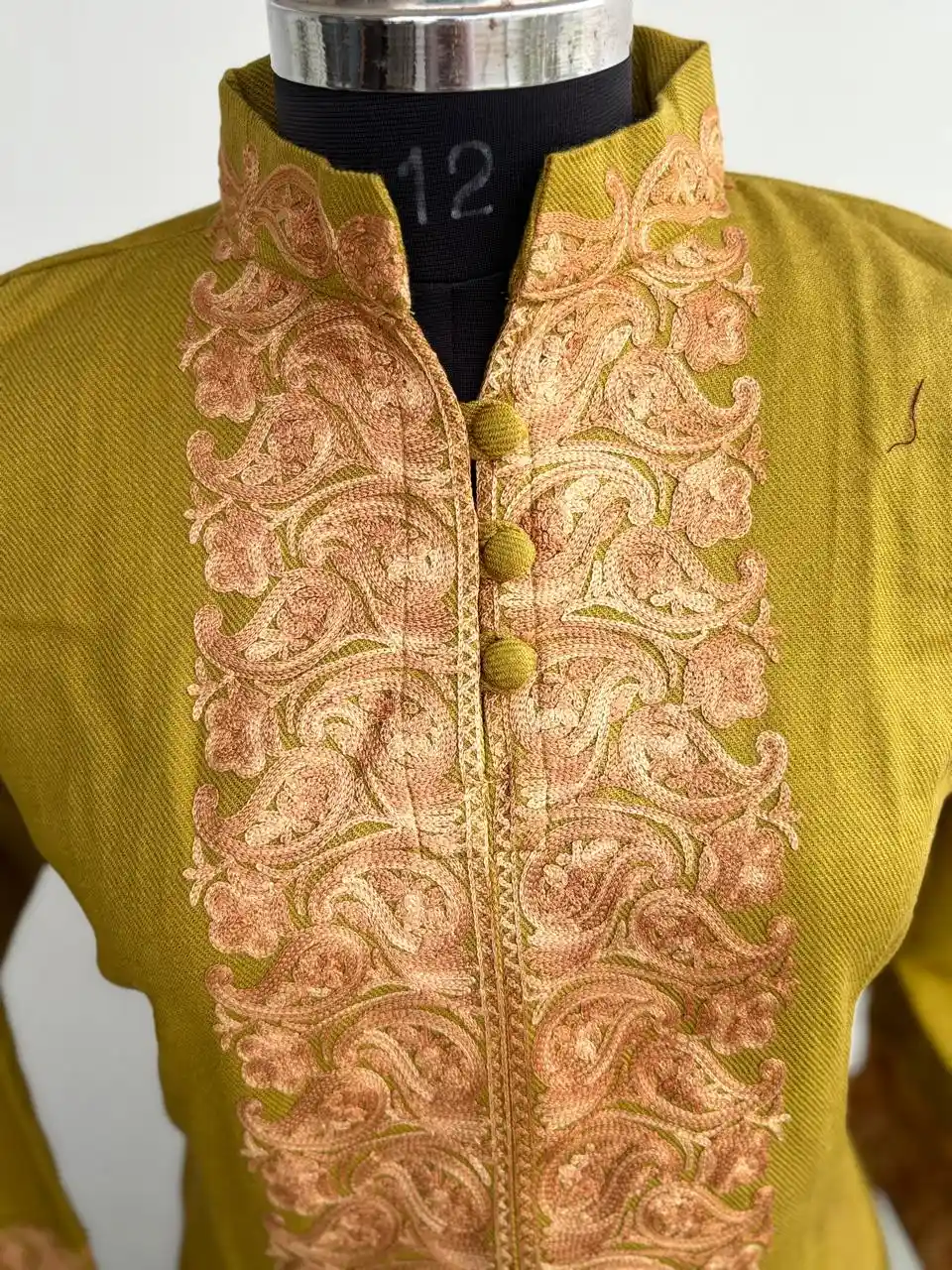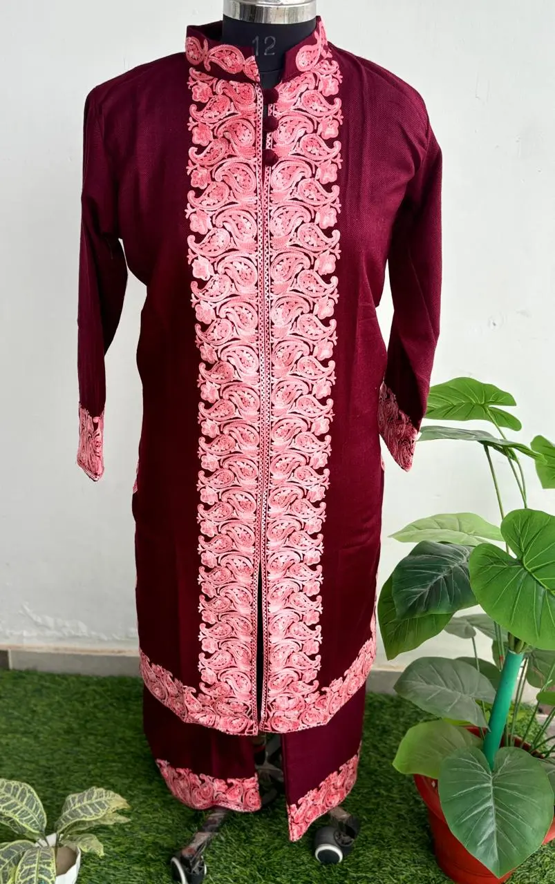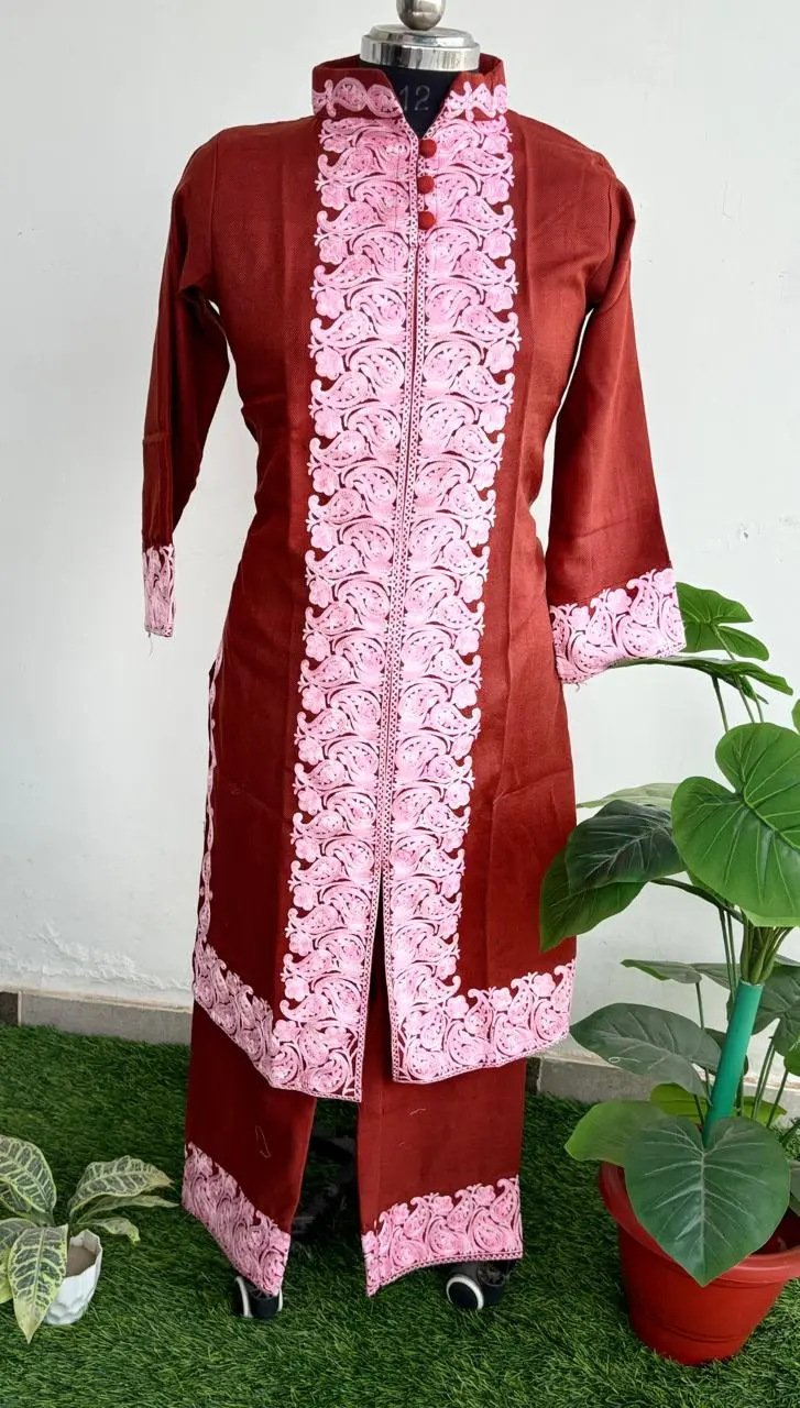 An elegant two-piece woolen suit featuring intricate and exquisite Kashmiri embroidery.